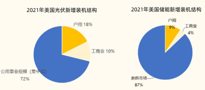 2021年美國(guó)光伏裝機(jī)量共計(jì)23.6GW,其中集中式(>1MW)光伏裝機(jī)17GW,占比72%,戶用/工商業(yè)分布式裝機(jī)分別占比17.8%/10.2%,美國(guó)儲(chǔ)能裝機(jī)結(jié)構(gòu)與光伏裝機(jī)結(jié)構(gòu)高度相似。