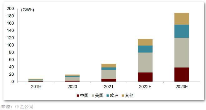 據(jù)中金公司預(yù)測(cè),今年全球儲(chǔ)能需求有望達(dá)189GWh,同比增長(zhǎng)超60%。美國(guó)、中國(guó)、歐盟成為全球三大儲(chǔ)能市場(chǎng)。