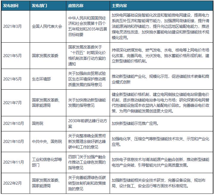 為加快新型儲能示范推廣應(yīng)用,我國發(fā)布了一系列行業(yè)政策,如2022年國家發(fā)展改革委、國家能源局發(fā)布的《關(guān)于加快推動新型儲能發(fā)展的指導(dǎo)意見》提出健全新型儲能價格機(jī)制,建立電網(wǎng)側(cè)獨(dú)立儲能電站容量電價機(jī)制,逐步推動儲能電站參與電力市場;研究探索將電網(wǎng)替代性儲能設(shè)施成本收益納入輸配電價回收。完善峰谷電價政策,為用戶側(cè)儲能發(fā)展創(chuàng)造更大空間。