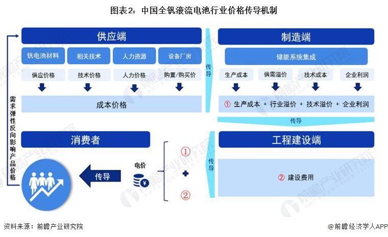 由于全釩液流電池主要應(yīng)用與長時儲能市場,該市場價格由行業(yè)供應(yīng)端、制造端、工程建設(shè)端的增值溢價及消費需求彈性共同作用而成、并逐級傳導(dǎo)。供應(yīng)端的成本價格包括釩電池材料價格、技術(shù)價格、人力價格和設(shè)備廠房的購置 / 購買價等,傳導(dǎo)至制造端成為生產(chǎn)成本,制造端綜合供需溢價、研發(fā)成本和企業(yè)利潤,形成 " 制造端價格 " 傳導(dǎo)至工程建設(shè)端 ; 工程建設(shè)端綜合建設(shè)費用,形成了最終電價傳導(dǎo)至消費者,而消費市場需求彈性也反作用于供應(yīng)端、制造端,形成 " 價格 - 需求 - 價格 " 的傳導(dǎo)路徑來影響中國電化學(xué)儲能市場的定價。