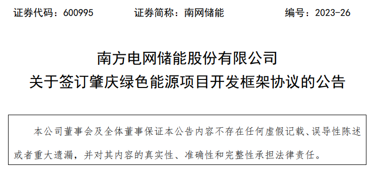 南網儲能于4月22日發(fā)布公告稱,南方電網儲能股份有限公司(乙方)于2023年4月21日與廣東省肇慶市發(fā)展和改革局(甲方)共同簽訂《肇慶綠色能源項目合作開發(fā)框架協(xié)議》。