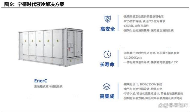 各大主流集成廠商近年來均推出了液冷產(chǎn)品,在能量密度、電池壽命上較風(fēng) 冷產(chǎn)品有了顯著提升。陽光電源的 PowerTitan 產(chǎn)品采用液冷溫控的方式,實(shí) 現(xiàn)了所有電芯溫差小于 2.5℃,使電池壽命延長 2 年以上。海博思創(chuàng)的HyperA2-C3354、HyperA2-C6709 產(chǎn)品采用了同程均衡液冷管路設(shè)計(jì),實(shí)現(xiàn)了 溫差不超過 3℃,電池壽命延長 20%。比亞迪的 Cube T28 產(chǎn)品采用了液冷技術(shù), 空間利用率遠(yuǎn)遠(yuǎn)高于傳統(tǒng)預(yù)留風(fēng)道的風(fēng)冷系統(tǒng)。寧德時(shí)代的 EnerC 產(chǎn)品,能量 密度較傳統(tǒng)風(fēng)冷系統(tǒng)提高了近兩倍,可將單簇 416 個(gè)電芯溫差控制在 3°C 以內(nèi), 全系統(tǒng) 4160 個(gè)電芯溫差控制在 5°C 以內(nèi)。