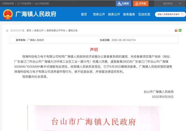 臺山市廣海鎮(zhèn)人民政府在2022年6月28日發(fā)布的一則聲明顯示:珠??苿?chuàng)電力電子有限公司(目前已更名為“珠海科創(chuàng)儲能科技有限公司”)利用廣海鎮(zhèn)人民政府經(jīng)濟發(fā)展辦公室備案系統(tǒng)的漏洞,未經(jīng)備案項目落戶地塊權(quán)屬人同意,虛假備案28億的廣東省江門市臺山市廣海鎮(zhèn)500MW/1000MWh集中式儲能電站項目。聲明稱,該鎮(zhèn)已于2022年6月28日撤銷該備案。