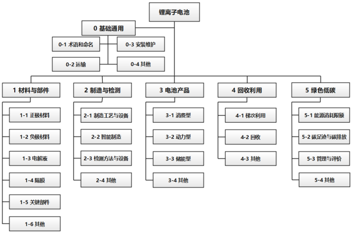 鋰離子電池綜合標(biāo)準(zhǔn)化技術(shù)體系主要包括基礎(chǔ)通用、材料與部件、制造與檢測、電池產(chǎn)品、回收利用、綠色低碳6大類、25個小類(見圖2)。