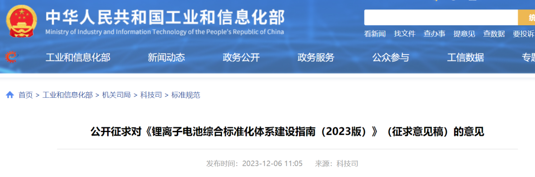 工信部公開征求對《鋰離子電池綜合標(biāo)準(zhǔn)化體系建設(shè)指南(2023版)》(征求意見稿)的意見