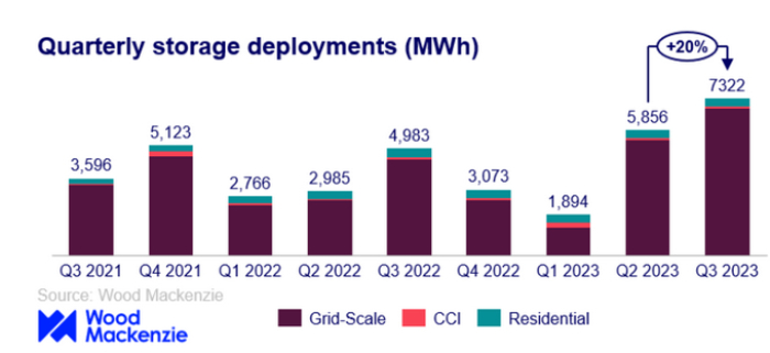 根據(jù)調(diào)研機(jī)構(gòu)Wood Mackenzie日前發(fā)布的研究報(bào)告,美國儲(chǔ)能行業(yè)又經(jīng)歷了一個(gè)破紀(jì)錄的季度,在2023年第三季度部署的儲(chǔ)能系統(tǒng)的裝機(jī)容量為2354MW,儲(chǔ)能容量為7322MWh。