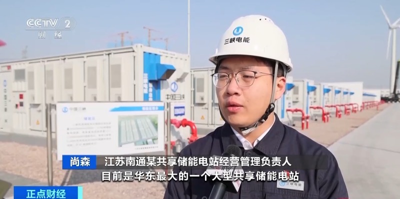 在江蘇南通市洋口鎮(zhèn),緊鄰著風(fēng)電光伏項(xiàng)目的是一排排由白色儲(chǔ)能艙構(gòu)成的共享儲(chǔ)能電站。負(fù)責(zé)人表示,這個(gè)項(xiàng)目于11月29日并網(wǎng)運(yùn)行,投資超過7.9億元??梢詫⒅車鄠€(gè)風(fēng)電和光伏電站發(fā)出的多余電量存儲(chǔ)起來,給居民區(qū)或工業(yè)企業(yè)供電。