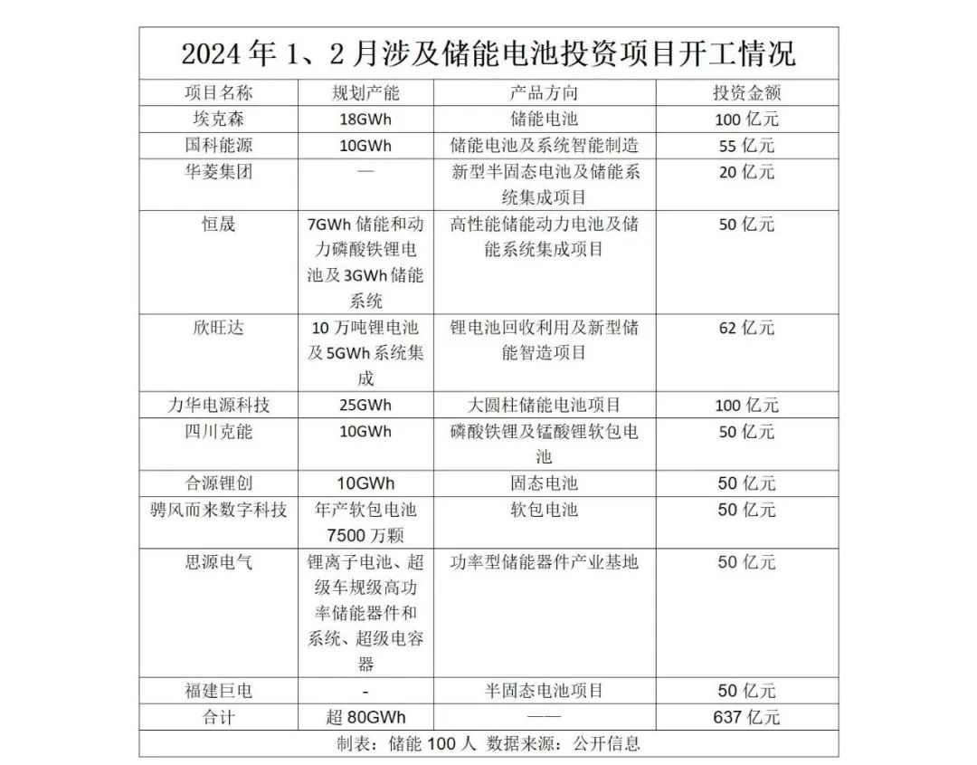 2024年剛開局,儲能電池擴產(chǎn)不停歇。據(jù)統(tǒng)計,1、2月涉及儲能電池的開工項目已超過10個,總產(chǎn)能超80GWh,總投資超600億元。