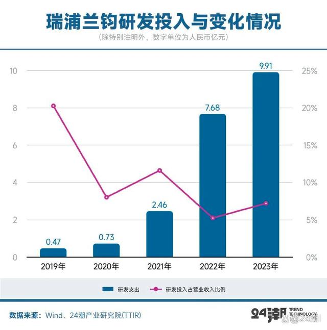 而瑞浦蘭鈞的技術突破與持續(xù)且強力的研發(fā)投入有很大關系。24潮產(chǎn)業(yè)研究院(TTIR)分析發(fā)現(xiàn),近幾年瑞浦蘭鈞研發(fā)投入一直保持增長趨勢,2023年其研發(fā)支出為9.91億元,同比增長了29.04%,研發(fā)投入占營業(yè)收入比例由2022年的5.24%提升至2023年的7.20%。