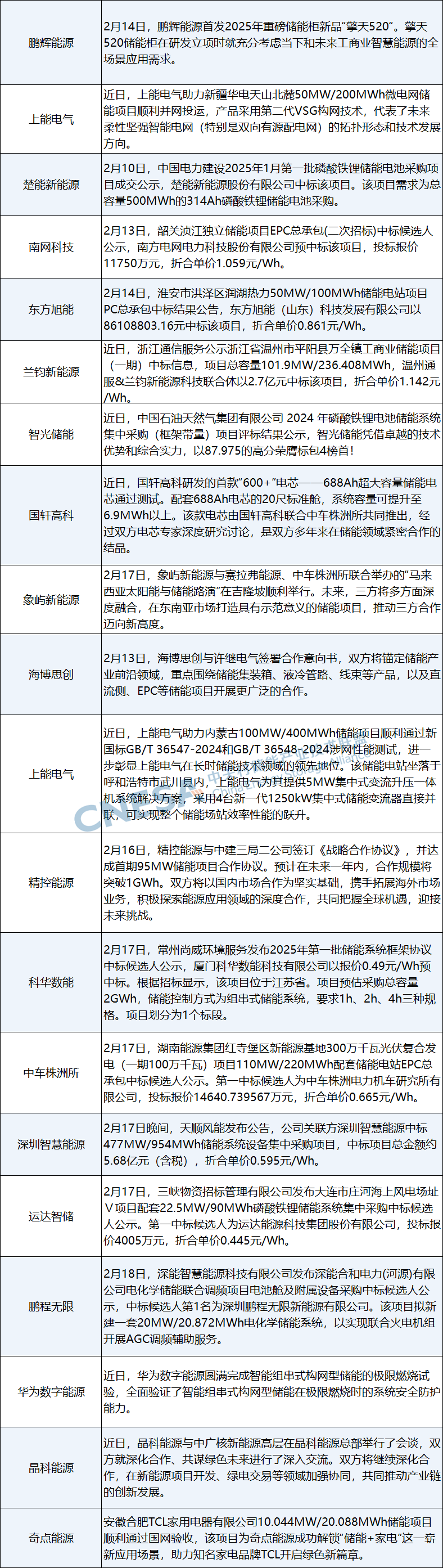 近兩周來(lái),楚能新能源、南網(wǎng)科技、中車株洲所、蘭鈞新能源、智光儲(chǔ)能、科華數(shù)能、運(yùn)達(dá)智儲(chǔ)、鵬程無(wú)限等企業(yè)中標(biāo)國(guó)內(nèi)儲(chǔ)能項(xiàng)目采購(gòu);上能電氣、奇點(diǎn)能源等項(xiàng)目順利并網(wǎng);華為數(shù)字能源圓滿完成智能組串式構(gòu)網(wǎng)型儲(chǔ)能的極限燃燒試驗(yàn);晶科能源與中廣核新能源深化了合作;鵬輝能源首發(fā)2025年工商業(yè)儲(chǔ)能柜新品“擎天520“;海博思創(chuàng)與許繼電氣錨定儲(chǔ)能產(chǎn)業(yè)前沿領(lǐng)域開展廣泛合作等等,國(guó)內(nèi)市場(chǎng)在招中標(biāo)、戰(zhàn)略合作、新品發(fā)布等方面全面出擊。