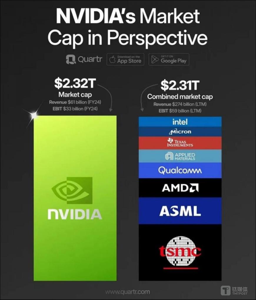 鈦媒體App 5月24日消息,截至今早美股收盤(pán),“AI之王”英偉達(dá)(NASDAQ:NVDA)市值一天內(nèi)暴漲2180億美元(約合人民幣1.56萬(wàn)億元),達(dá)到2.56萬(wàn)億美元市值——超過(guò)臺(tái)積電、阿斯麥、AMD、高通、應(yīng)用材料、德州儀器、美光科技、英特爾等半導(dǎo)體巨頭的市值總和。同時(shí),股價(jià)也首次沖破1000美元/股,創(chuàng)下歷史新高。