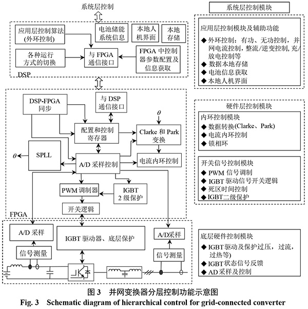 參照通信系統(tǒng)的開放系統(tǒng)互連(open system in-terconnection,OSI)模型,并網變換器分層控制功能示意圖如圖3所示。圖3中:θ為電網電壓相位;SPLL(software phase loop)為軟鎖相環(huán)[11];IGBT(insulated gate bipolar transistor)為絕緣柵雙極型晶體管。硬件層控制模塊由FPGA完成;應用層控制模塊由DSP完成算法運算,提高了系統(tǒng)靈活性;系統(tǒng)層控制由上位機完成,可以實現多個儲能系統(tǒng)的大規(guī)模調度。層次化的并網變換器接口如圖4所示。