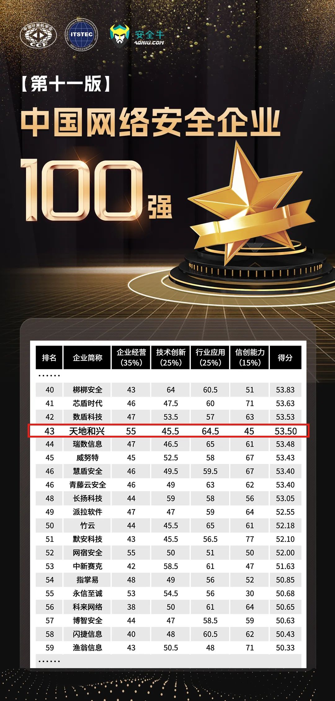 TOP50! 天地和興連續(xù)五年入選“中國網(wǎng)絡(luò)安全企業(yè)100強”