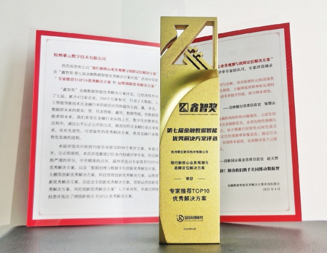 “鑫智獎”作為金融數(shù)據(jù)智能領(lǐng)域的重要獎項,已連續(xù)舉辦七屆,致力于挖掘并推廣金融科技與數(shù)據(jù)智能深度融合的優(yōu)秀成果,彰顯數(shù)據(jù)智能在金融場景中的落地成效和未來潛力。2025年評選活動共計收到來自70家企業(yè)的99個方案參評,經(jīng)過27位專家評審與答辯打分,評選出專家推薦TOP10優(yōu)秀解決方案。乘云數(shù)字此次獲獎的“專家推薦TOP10優(yōu)秀解決方案”,圍繞國內(nèi)銀行新一代核心系統(tǒng)的復(fù)雜性面臨的全新運行穩(wěn)定性挑戰(zhàn),在快速的發(fā)現(xiàn)問題、定位問題、處理問題及大模型新技術(shù)的應(yīng)用等方面展現(xiàn)出專業(yè)、系統(tǒng)的技術(shù)優(yōu)勢,獲得專家組高度認(rèn)可。