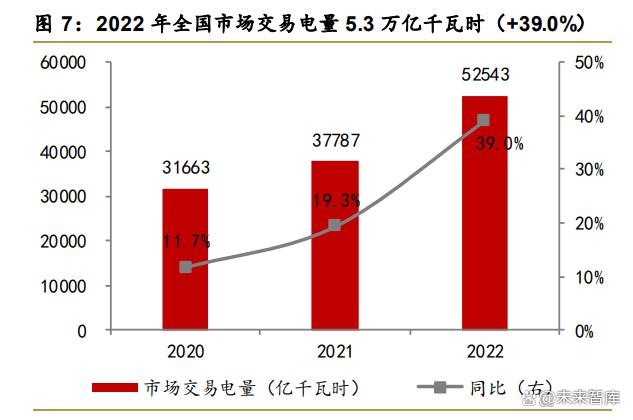 全國市場化交易電量占全社會用電量的比重逐年上升。新一輪電改實施以來,我國電力 市場建設穩(wěn)步有序推進,價格機制也愈加完善,市場化交易電量占全社會用電量的比重大幅 提升。2022 年全國市場交易電量約 5.3 萬億千瓦時,同比高增 39.0%,占全社會用電量比 重為 60.8%,較 2021 年提升 15.3pp。據(jù)中電聯(lián)《中國電力行業(yè)年度發(fā)展報告 2022》顯示, 截至 2021 年底,全國各電力交易中心累計注冊市場主體 46.7 萬家,數(shù)量較 2020 年增長 76.0%。電力市場化建設具備先進性,一方面,市場化價格有利于充分反映電力市場真實供 需變化,煤價上漲等成本壓力通過更高電價傳導到下游的機制更順暢;另一方面,電力市場 化交易有利于實現(xiàn)電力資源在全國范圍內(nèi)的優(yōu)化配置,更好實現(xiàn)跨省跨區(qū)電力傳送。