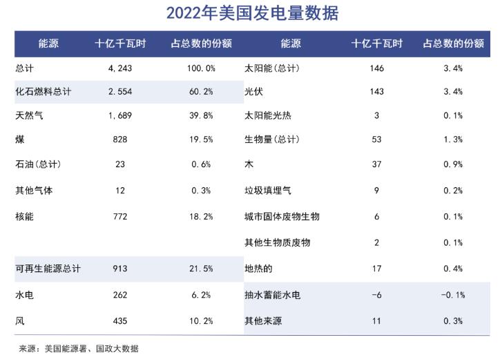 在《通脹削減法案》的刺激下,美國在新能源的道路上疾馳,煤電貢獻(xiàn)度明顯下降,風(fēng)光等可再生能源逐漸成為主力軍。2022年,美國煤電份額從23%減少到20%,核能從20%減少到18%。