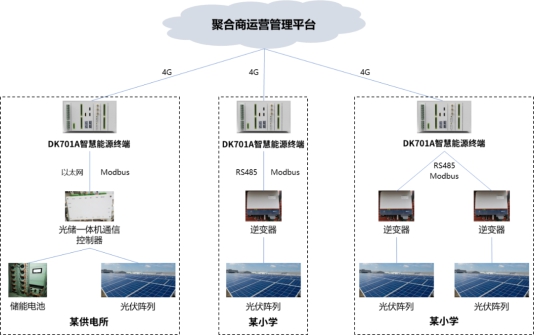 基于DK701智能終端平臺(tái)的優(yōu)勢(shì)特性,目前江行智能已成功開發(fā)DK701A智慧能源終端和DK701E儲(chǔ)能EMS就地控制器,并應(yīng)用到虛擬電廠聚合商運(yùn)營(yíng)管理系統(tǒng)及數(shù)字配電網(wǎng)臺(tái)區(qū)儲(chǔ)能等項(xiàng)目建設(shè),在光伏、儲(chǔ)能、充電樁等具體場(chǎng)景發(fā)揮了重要作用。以國(guó)網(wǎng)寧夏某公司打造的聚合商運(yùn)營(yíng)管理系統(tǒng)為例,通過在供電所、小學(xué)配置智慧能源終端,可將自身所擁有的分布式光伏、分布式儲(chǔ)能、電采暖等可調(diào)節(jié)資源數(shù)據(jù)接入省級(jí)虛擬電廠運(yùn)營(yíng)管理平臺(tái),實(shí)現(xiàn)對(duì)可調(diào)節(jié)資源的可觀、可測(cè)、可調(diào)、可控。