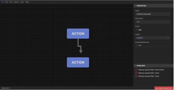 2.攻擊鏈建模編輯器:在瀏覽器中運(yùn)行,幾分鐘內(nèi)便可完成攻擊流程的創(chuàng)建。該編輯器提供了一個(gè)工作空間,用戶可以輸入攻擊行動(dòng)及其他背景信息,通過繪制箭頭,用戶可將這些信息編織成一個(gè)攻擊流程,明確展示事件或活動(dòng)中觀察到的攻擊技術(shù)執(zhí)行順序。