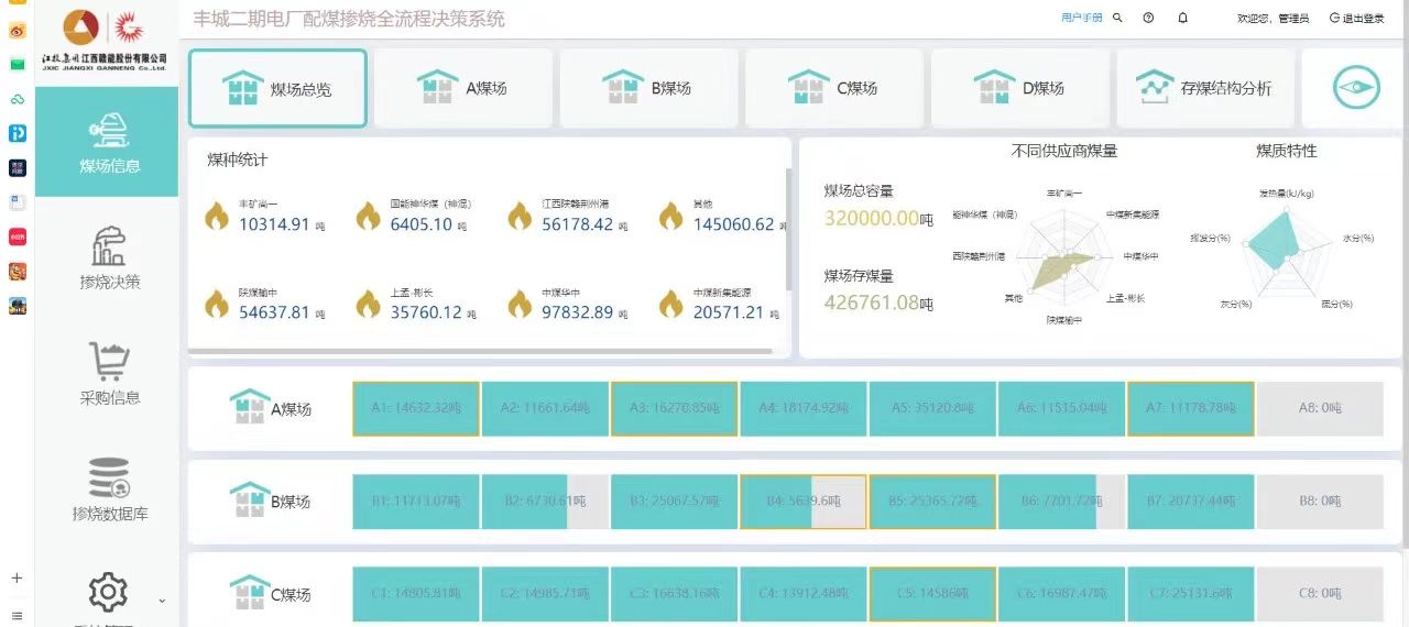 江投集團(tuán)所屬豐城電廠將配煤摻燒與燃料管理中的關(guān)鍵環(huán)節(jié)(燃料采購、場存堆取、配煤摻燒)、燃燒優(yōu)化、排放達(dá)標(biāo)等因素統(tǒng)籌關(guān)聯(lián),大幅減少人員的分析和決策參與,提高了系統(tǒng)運(yùn)行效率和可靠性,最大程度提高經(jīng)濟(jì)煤種的摻燒比例。2023年1—10月,豐城電廠累計(jì)摻燒低灰熔點(diǎn)煤259.93萬噸,全年低灰熔點(diǎn)摻燒比例比2020—2022年平均值增加約10%,全年可多摻燒低灰熔點(diǎn)煤19萬噸,經(jīng)濟(jì)、社會(huì)效益顯著。