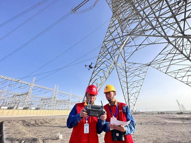 圖為新疆送變電公司員工在750千伏車楚一線001號(hào)開展無人機(jī)自主巡檢(張志文 攝)