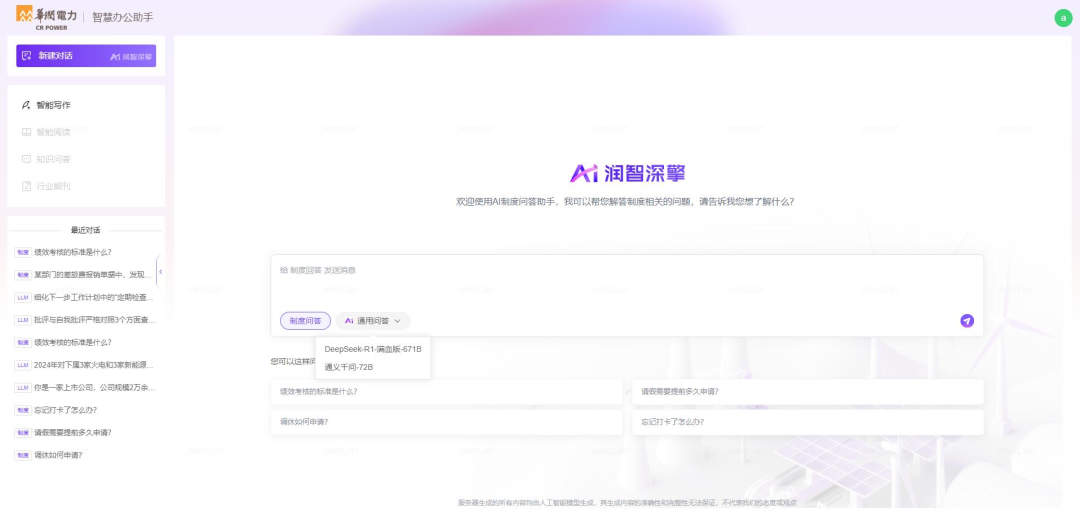 華潤(rùn)電力基于DeepSeek671B大模型的深度解析能力,對(duì)419份制度文件進(jìn)行結(jié)構(gòu)化處理,構(gòu)建制度知識(shí)庫,初步實(shí)現(xiàn)制度問答功能驗(yàn)證。