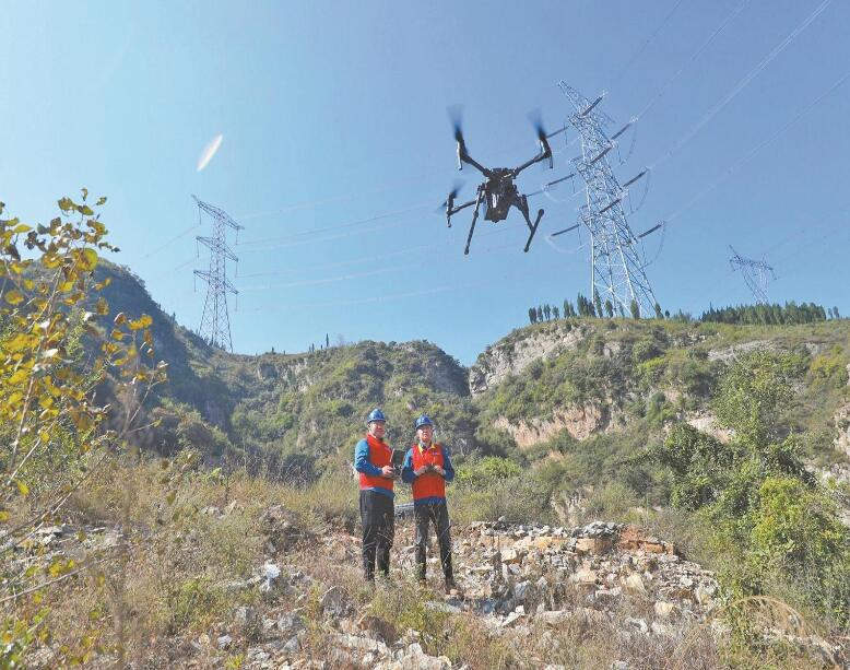 黨員服務隊隊員利用無人機巡檢1000千伏泉樂線。隗茂春 攝