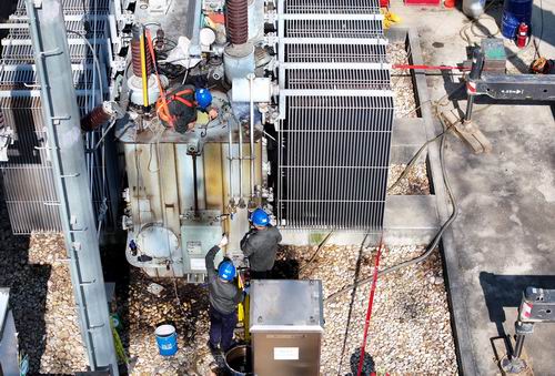 國(guó)網(wǎng)商丘供電公司充分利用秋檢時(shí)機(jī),集中技術(shù)力量,加強(qiáng)對(duì)設(shè)備開展大修、技改、維護(hù)工作,確保設(shè)備安全穩(wěn)定運(yùn)行。圖為10月31日,該公司人員在110千伏宋城變電站開展檢修施工。(王輝 趙沖)
