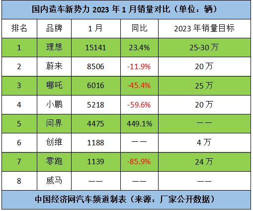與之形成鮮明對照的是,1月,7家國內(nèi)造車新勢力的銷量環(huán)比上個(gè)月都呈現(xiàn)不同幅度的下滑;從銷量同比增幅來看,除理想和問界實(shí)現(xiàn)正增長外,其他品牌則有不同程度下滑。數(shù)據(jù)顯示,1月,理想、蔚來、哪吒、小鵬、賽力斯、創(chuàng)維和零跑的銷量分別為15141輛、8506輛、6016輛、5218輛、4475輛、1188輛、1139輛。