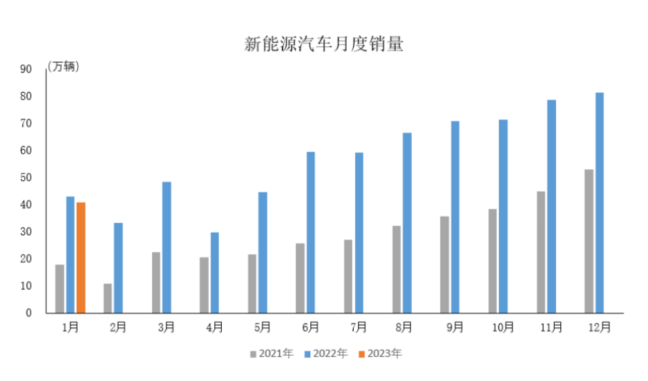 2023年1月,新能源汽車(chē)產(chǎn)銷(xiāo)分別完成42.5萬(wàn)輛和40.8萬(wàn)輛,環(huán)比分別下降46.6%和49.9%,同比分別下降6.9%和6.3%,市場(chǎng)占有率達(dá)到24.7%。與2022年春節(jié)月(2月份)相比,產(chǎn)銷(xiāo)分別增長(zhǎng)15.4%和22.2%。