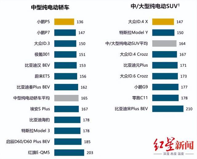 在中型純電動轎車細(xì)分市場,小鵬P5以136個PP100排名第一,紅旗E-QM5以203個PP100排名倒數(shù)第一,細(xì)分市場平均數(shù)為165個PP100。