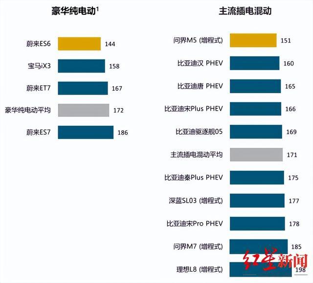在豪華純電動細(xì)分市場,蔚來ES6以144個PP100排名第一,蔚來ES7以186個PP100排名倒數(shù)第一,細(xì)分市場平均數(shù)為172個PP100。