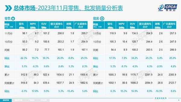 12月8日,乘用車市場信息聯(lián)席會發(fā)布乘用車市場月度數(shù)據(jù)。11月,國內(nèi)狹義乘用車生產(chǎn)、批發(fā)、零售端皆呈現(xiàn)同環(huán)比雙增長的有力表現(xiàn),并連續(xù)第三個月齊齊站上200萬輛關(guān)口。1-11月,狹義乘用車生產(chǎn)、批發(fā)、零售累計增速繼續(xù)擴大,分別達(dá)到7.4%、8.9%和5.3%,較1-10月各自提升1.9、1.7和2.1個百分點。