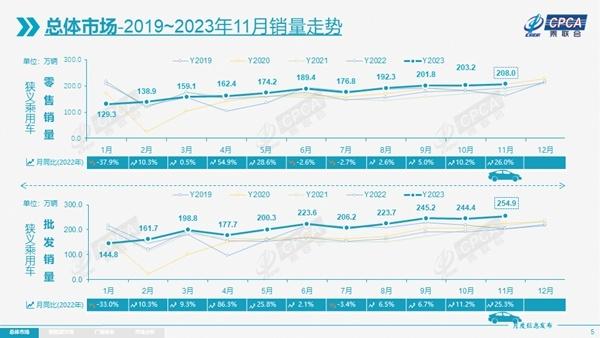 零售方面,11月,狹義乘用車共售出208.0萬輛,同比增長26.0%,環(huán)比增長2.4%;1-11月累計零售量達(dá)1934.5萬輛,同比增長5.3%。乘聯(lián)會秘書長崔東樹分析, “近年來,乘用車市場在年末持續(xù)升溫已成為常態(tài)走勢,這主要是受新能源車持續(xù)增長以及小批量國六a車型清庫存推動。今年11月,車市促銷力度維持較高水平,地方補貼頻出,因此乘用車銷量繼續(xù)抬升。”