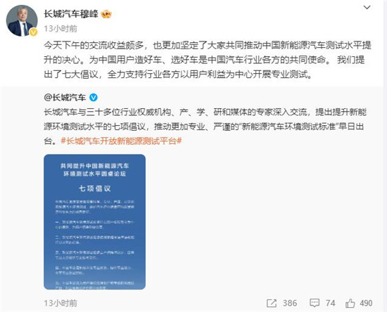 “今天下午的交流收益頗多,也更加堅(jiān)定了大家共同推動(dòng)中國(guó)新能源汽車(chē)測(cè)試水平提升的決心。為中國(guó)用戶(hù)造好車(chē)、選好車(chē)是中國(guó)汽車(chē)行業(yè)各方的共同使命。”12月14日,長(zhǎng)城汽車(chē)總裁穆峰在其個(gè)人社交平臺(tái)表示,“我們提出了七大倡議,全力支持行業(yè)各方以用戶(hù)利益為中心開(kāi)展專(zhuān)業(yè)測(cè)試。”