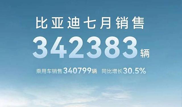 比亞迪官方公布其7月乘用車(chē)銷(xiāo)售340799輛,同比增長(zhǎng)30.5%,純電車(chē)型銷(xiāo)量達(dá)130,000輛,插混車(chē)型210,799輛。1-7月,比亞迪乘用車(chē)?yán)塾?jì)銷(xiāo)售1,947,944輛,同比增長(zhǎng)29.07%。