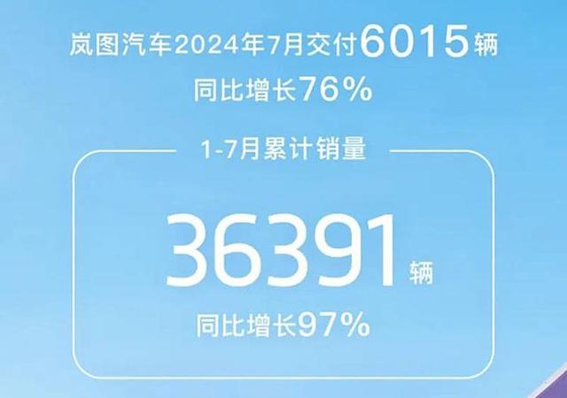 月嵐圖汽車(chē)交付6015輛,同比增長(zhǎng)76%,1-7月累計(jì)交付36391輛,同比增長(zhǎng)97%。