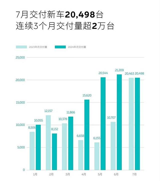 蔚來(lái)7月共計(jì)交付新車(chē)20498臺(tái),同比增長(zhǎng)0.17%,連續(xù)3個(gè)月交付量超2萬(wàn)臺(tái)。今年1-7月,蔚來(lái)共交付新車(chē)107924臺(tái),同比增長(zhǎng)43.85%。截至目前,蔚來(lái)已累計(jì)交付新車(chē)557518臺(tái)。