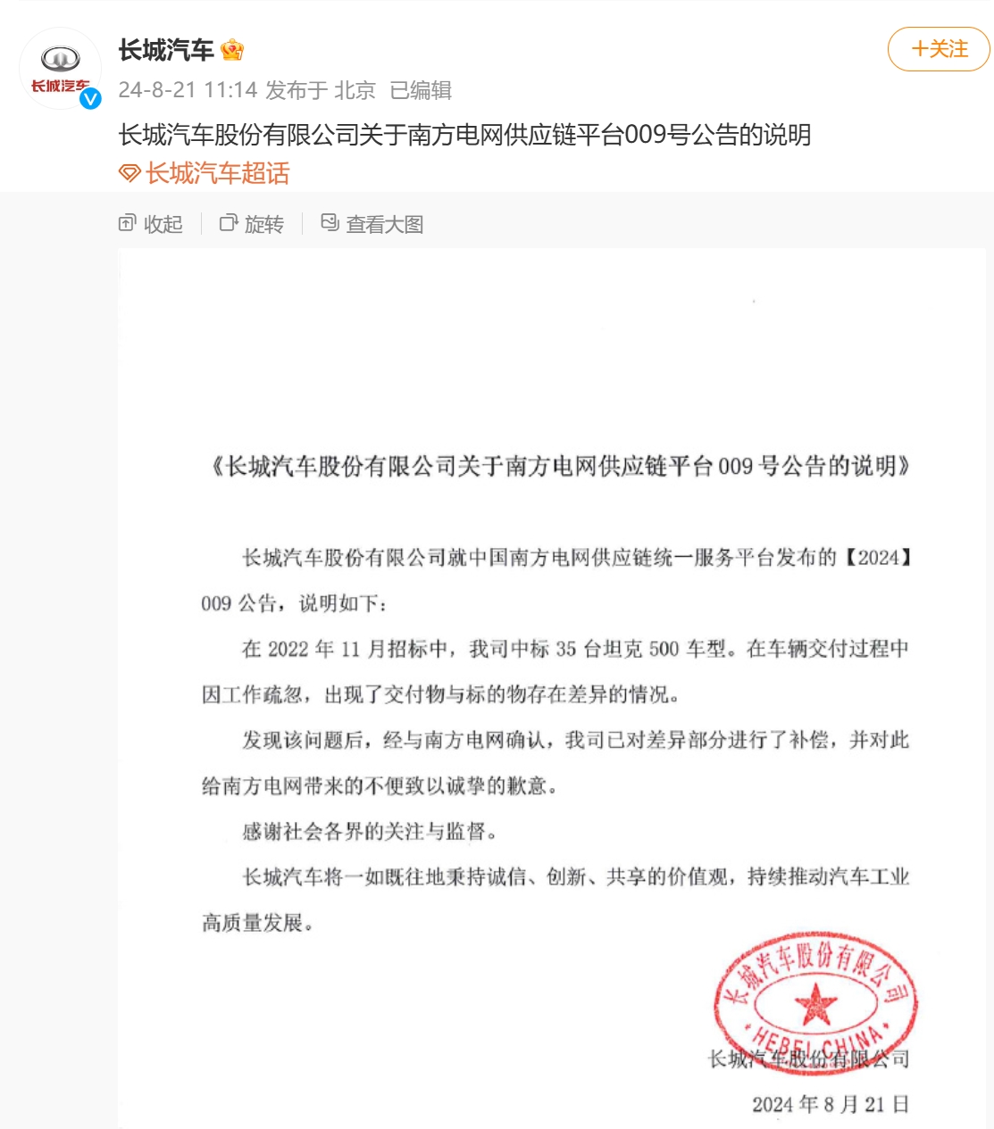 8月21日,長(zhǎng)城汽車(chē)發(fā)布關(guān)于南方電網(wǎng)供應(yīng)鏈平臺(tái)009號(hào)公告的說(shuō)明。長(zhǎng)城汽車(chē)稱(chēng),在2022年11月招標(biāo)中,長(zhǎng)城汽車(chē)中標(biāo)35臺(tái)坦克500車(chē)型。在車(chē)輛交付過(guò)程中因工作疏忽,出現(xiàn)了交付物與標(biāo)的物存在差異的情況。發(fā)現(xiàn)該問(wèn)題后,經(jīng)與南方電網(wǎng)確認(rèn),長(zhǎng)城汽車(chē)已對(duì)差異部分進(jìn)行了補(bǔ)償,并對(duì)此給南方電網(wǎng)帶來(lái)的不便致以誠(chéng)摯的歉意。此前,根據(jù)南方電網(wǎng)發(fā)布的供應(yīng)商處理公告,長(zhǎng)城汽車(chē)被南方電網(wǎng)列為“不接受投標(biāo)”的供應(yīng)商。