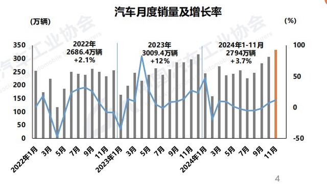 中汽協(xié)數(shù)據(jù)顯示,1~11月,我國(guó)汽車(chē)產(chǎn)銷(xiāo)分別完成2790.3萬(wàn)輛和2794萬(wàn)輛,同比分別增長(zhǎng)2.9%和3.7%,汽車(chē)產(chǎn)量增速較1~10月擴(kuò)大1.1個(gè)百分點(diǎn),銷(xiāo)量增速擴(kuò)大1個(gè)百分點(diǎn)。