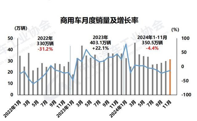 數(shù)據(jù)顯示,1~11月,商用車(chē)國(guó)內(nèi)銷(xiāo)量為267.9萬(wàn)輛,同比下降9.9%;商用車(chē)出口量為82.6萬(wàn)輛,同比增長(zhǎng)19.3%。其中,11月,商用車(chē)國(guó)內(nèi)銷(xiāo)量24.4萬(wàn)輛,同比下降15.8%;商用車(chē)出口7.1萬(wàn)輛,同比下降6.6%。