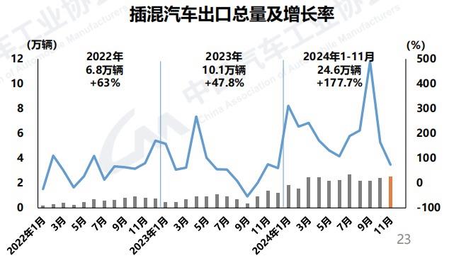 細(xì)分來(lái)看,插電式混合動(dòng)力汽車(chē)出口增速已遠(yuǎn)超純電動(dòng)汽車(chē)。數(shù)據(jù)顯示,1~11月,我國(guó)純電動(dòng)汽車(chē)出口89.4萬(wàn)輛,同比下降10.8%;插電式混合動(dòng)力汽車(chē)出口24.6萬(wàn)輛,同比增長(zhǎng)1.8倍。其中,11月,純電動(dòng)汽車(chē)出口5.8萬(wàn)輛,環(huán)比下降43.8%,同比下降29.2%;插電式混合動(dòng)力汽車(chē)出口2.5萬(wàn)輛,環(huán)比增長(zhǎng)1.9%,同比增長(zhǎng)74.3%。