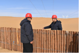 李平帶頭設計研究安裝防風固沙柵欄,保護輸電鐵塔免遭風沙侵移損壞。
