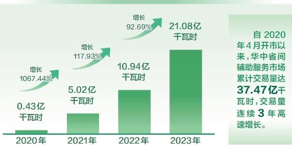 華中省間電力輔助服務(wù)市場(chǎng)交易量(省間調(diào)峰輔助服務(wù)交易量+省間備用輔助服務(wù)交易量)連續(xù)3年高速增長(zhǎng)。2020年、2021年、2022年、2023年交易量分別為0.43億、5.02億、10.94億、21.08億千瓦時(shí),2021、2022、2023年交易量分別同比增長(zhǎng)1067.44%、117.93%、92.69%。自2020年4月開(kāi)市以來(lái),市場(chǎng)累計(jì)交易量達(dá)37.47億千瓦時(shí)。