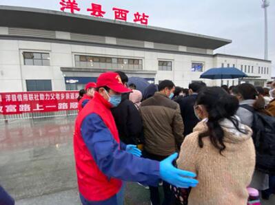 青年戰(zhàn)“疫”突擊隊攜帶一次性雨衣、純凈水等物資前往洋縣西站,參與了運送農民工復工返崗高鐵專列的志愿服務活動,不畏風雨積極助力復工復產。