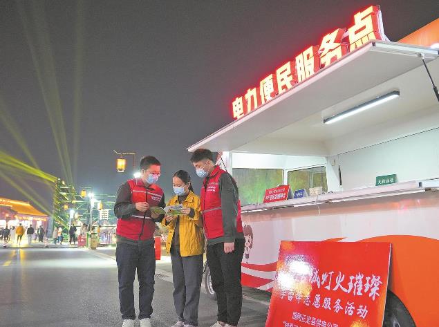 國家電網(wǎng)河北電力(知愛正定)共產(chǎn)黨員服務(wù)隊隊員在正定南城門景區(qū)門口為游客講解安全用電知識。王璞詩 攝