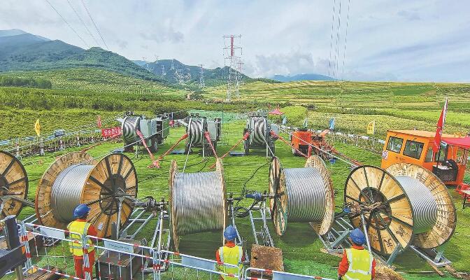 日月山—杜鵑雙回線路工程導(dǎo)線展放作業(yè)現(xiàn)場(chǎng)。鄒建華 攝