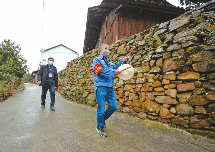 2月5日,貴州省黔東南苗族侗族自治州三穗縣八弓鎮(zhèn)高寨村響洞寨,貴州電網(wǎng)公司凱里三穗供電局駐高寨村幫扶干部羅德杰(右一)和村委干部一同,一個(gè)負(fù)責(zé)敲鑼,一個(gè)負(fù)責(zé)提著播放器,穿梭于寨子里,向村民宣傳防疫知識(shí)。 萬(wàn)明忠 攝