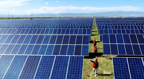 國網(wǎng)青海電力員工在海南州光伏產(chǎn)業(yè)園區(qū)檢查設(shè)備運行情況。