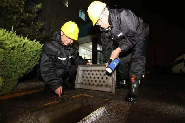 國網(wǎng)江蘇南通供電公司員工冒雨檢查閘口用電設備,確保安全運行。