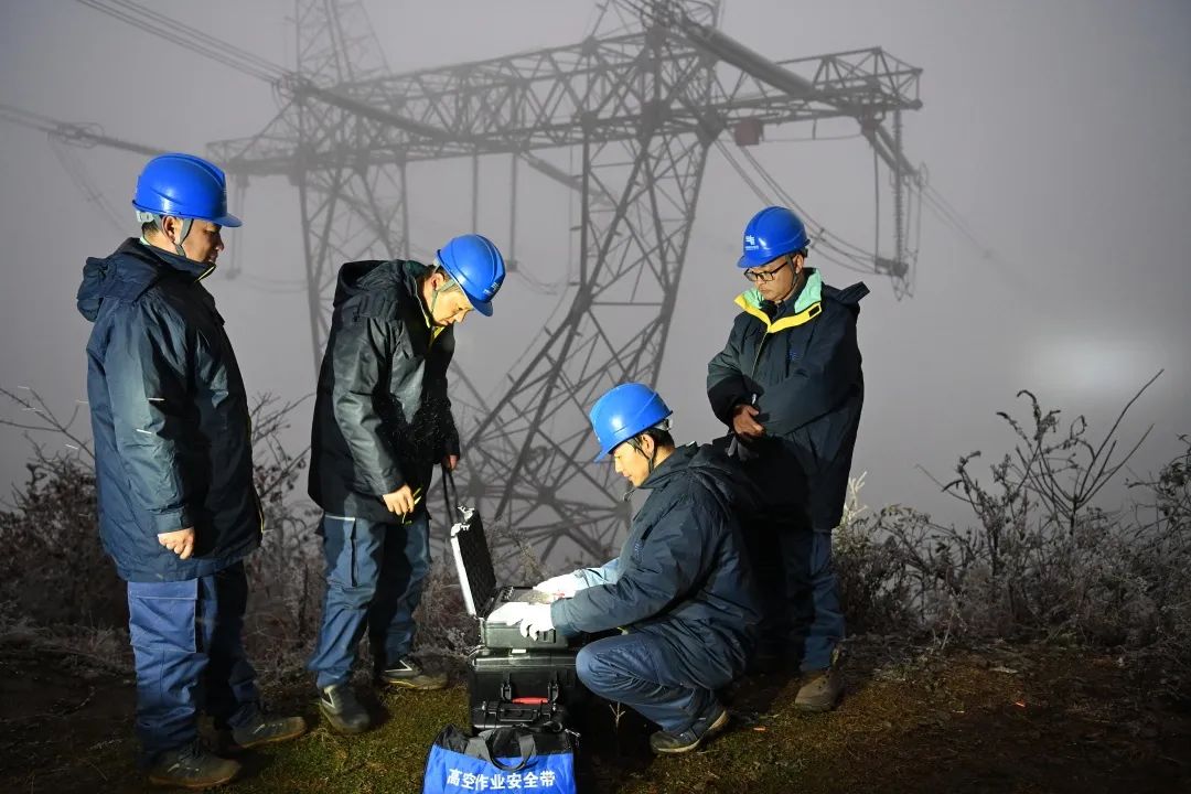 南方電網(wǎng)超高壓公司柳州局黨員突擊隊在500千伏線路所在地測量風速、濕度,量冰厚、觀冰情。(焦偉軍 攝)